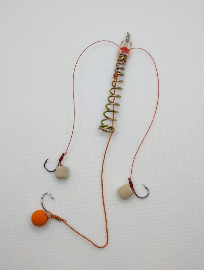 Chuveirinho com mola fixadora de massa, confeccionado com dois anzóis chinu de aço carbono na parte superior, eva branco 10mm, girador e um anzol no matator modelo maruseigo 18 com eva laranja , indicado para pescarias com massas de fundo em pesqueiros.