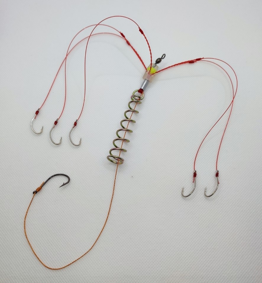 Chuveirinho com mola fixadora de massa, confeccionado com cinco anzóis de aço carbono importato na parte superior anzol maruseigo 16 importado, girador e um anzol no matator modelo maruseigo 18 importado, indicado para pescarias em pesqueiros.