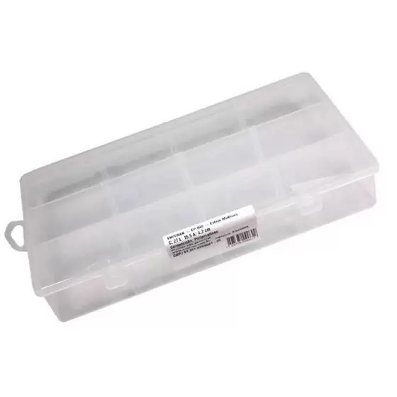 Estojo com 3 divisórias centrais fixas e 9 divisórias reguláveis totalizando até 12 compartimentos.